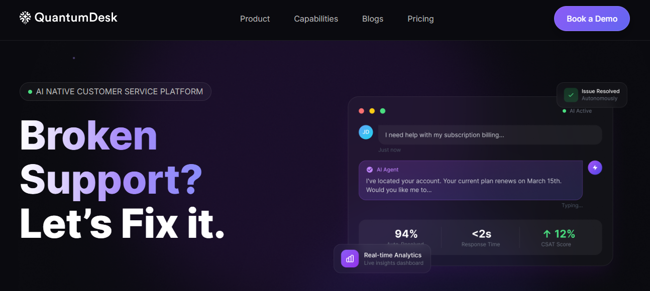 QuantumDesk is an AI-native customer service platform where AI is embedded across the entire support lifecycle.